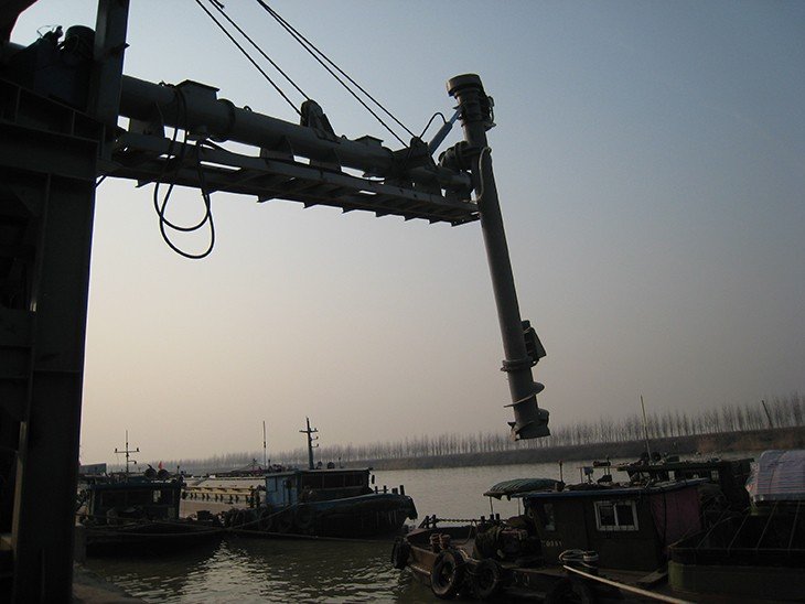 固定旋转式:安装在码头岸边固定基础上,依靠水平臂绕回转塔旋转与垂直取料器提取料。
